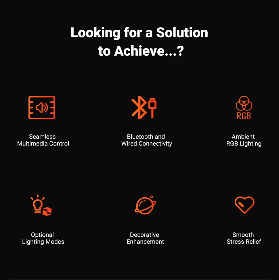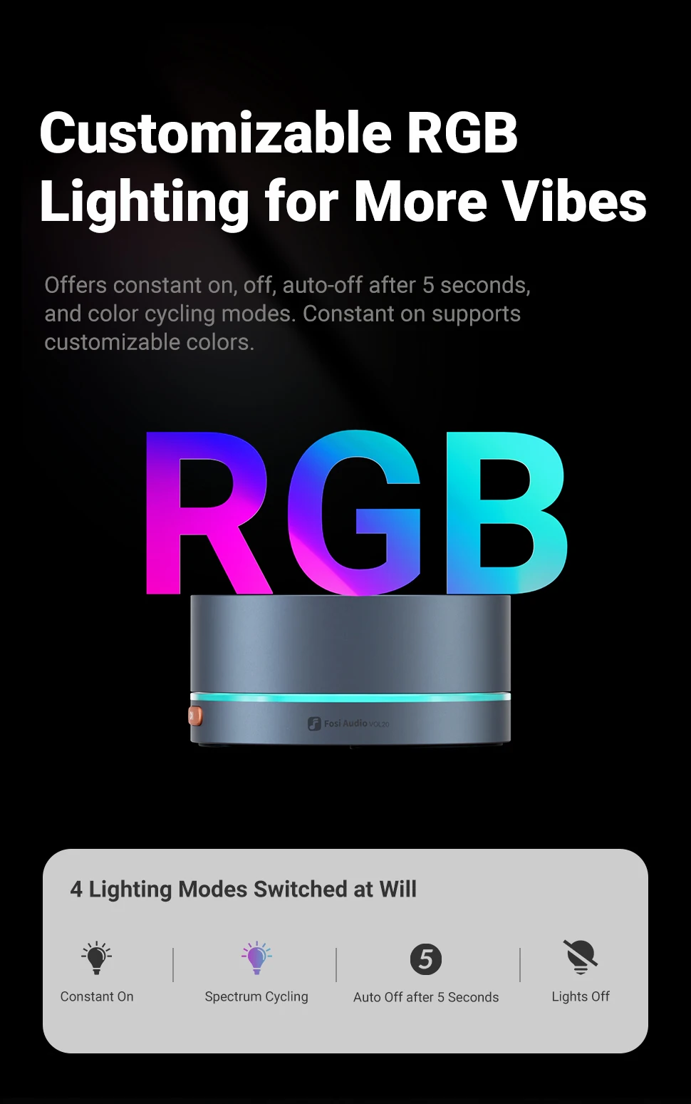 - RGB Lighting: Offers constant on, auto-off after 5 seconds, spectrum cycling, and off modes. Four modes at your fingertips—freely switch between colors and lighting modes to create the perfect ambiance just the way you like it