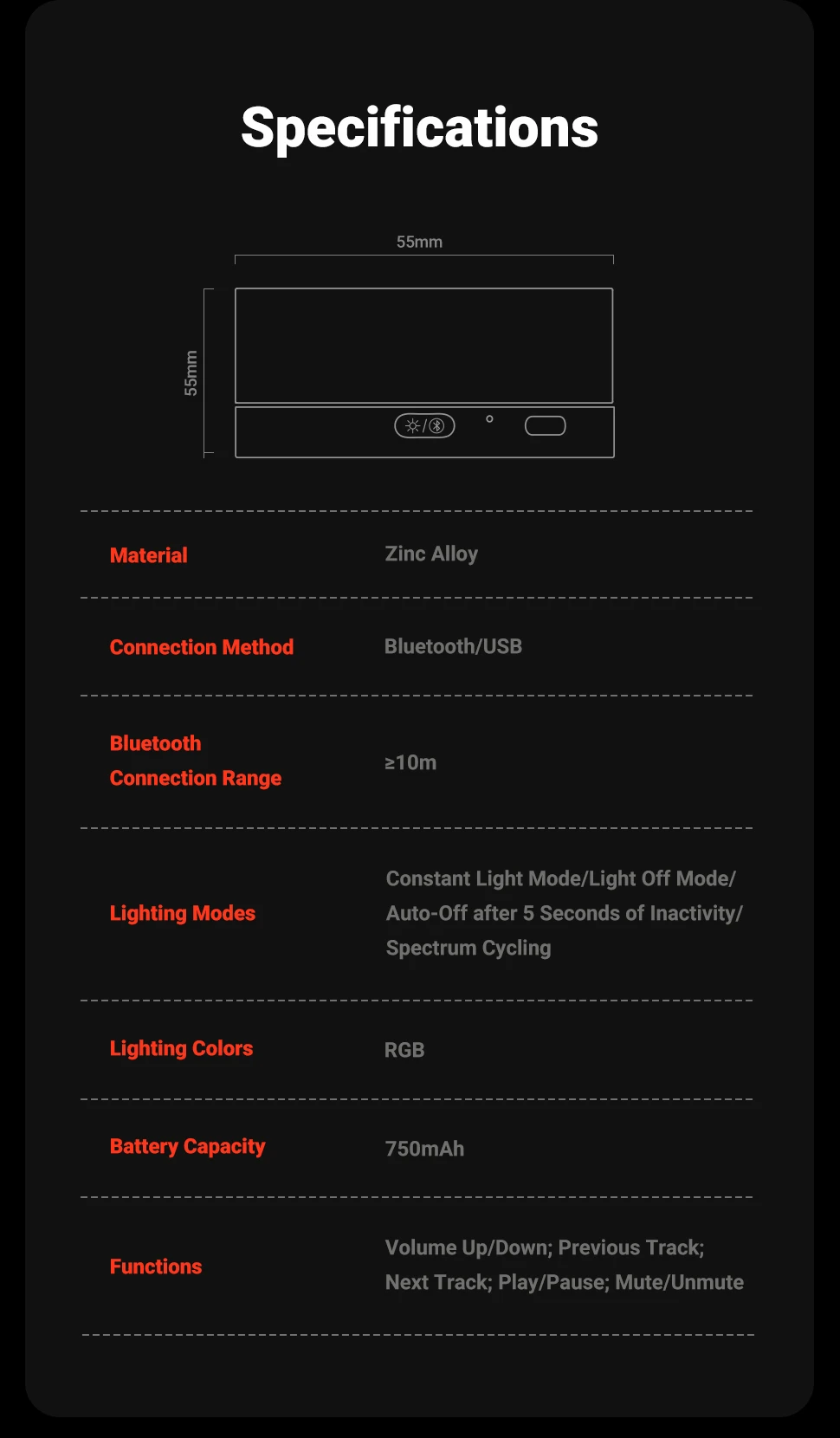 - Functions:Volume Up/Down; Previous Track; Next Track; Play/Pause; Mute/Unmute